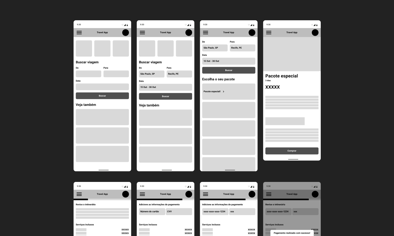 With the flow ready, we developed wireframes for the screens to be able to plan the elements that would be on each screen, visually presenting the ideas and functionalities thought out during the development of the user flow.